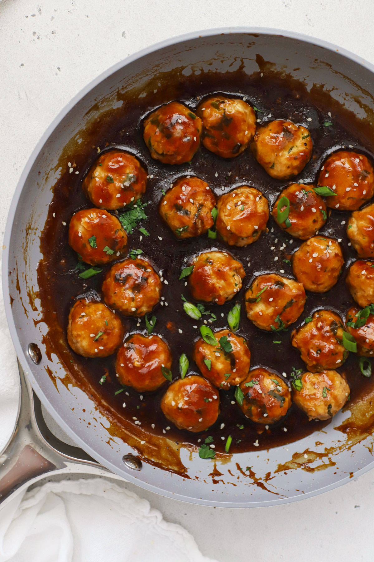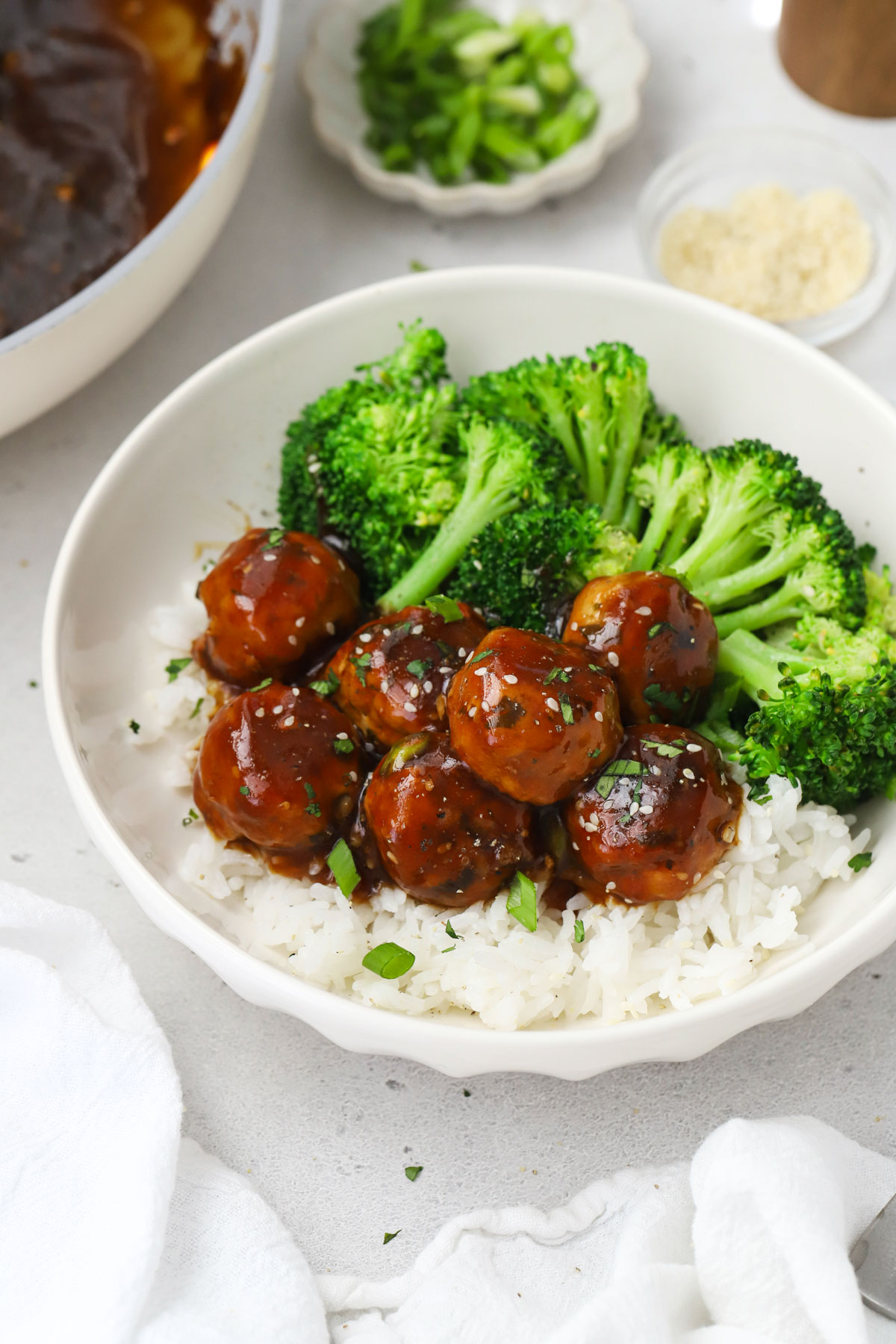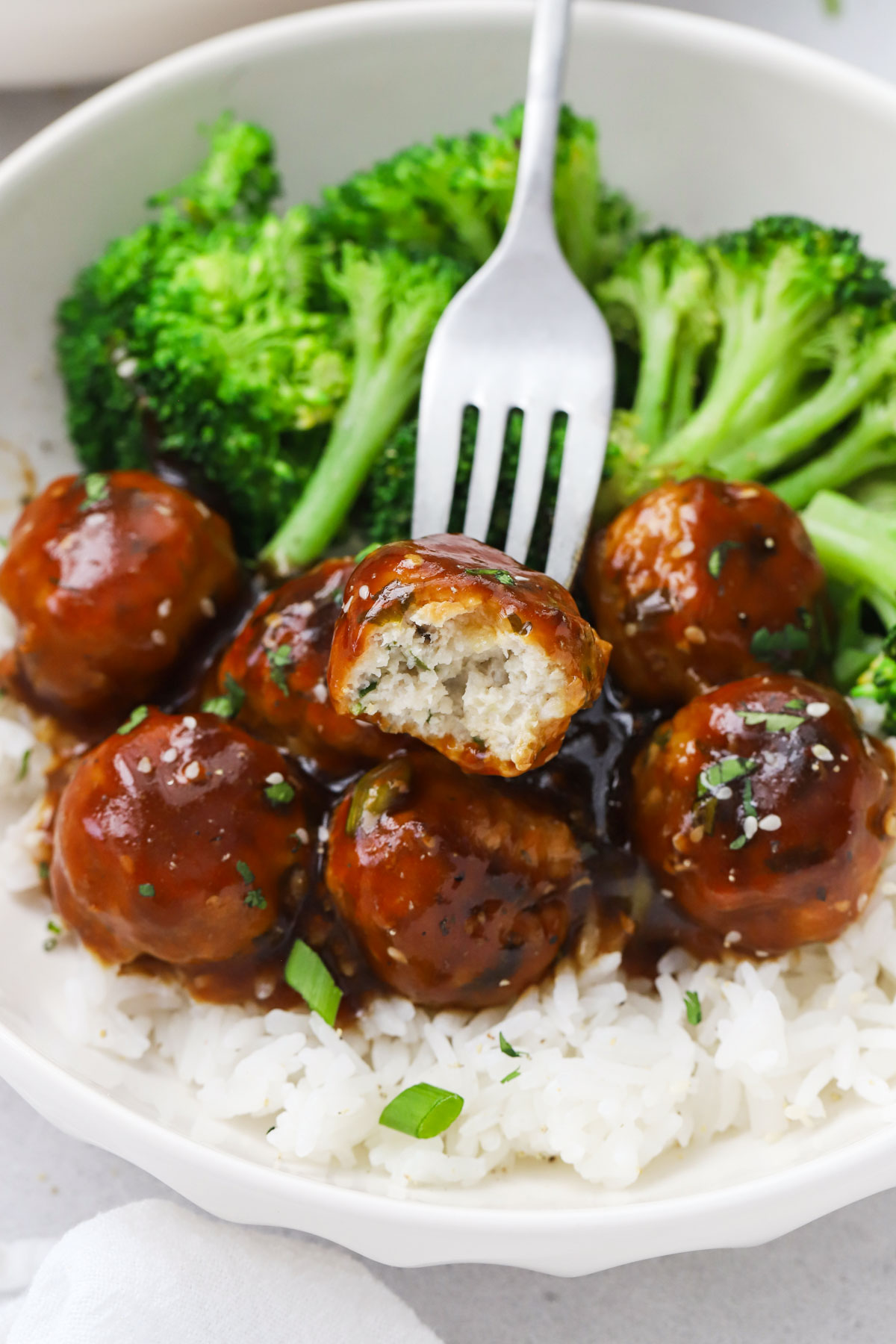 Can I Use Store-Bough Teriyaki Sauce Instead? Yep! If you’re using store-bought sauce, you may want to use less than I do, or cut it with water if if runs salty. My favorite store-bought sauce to use on a busy night is Bachan’s gluten-free Japanese BBQ sauce. Instead of tossing the meatballs in the sauce, I cook them through completely, then drizzle just a little sauce on top before serving, since this sauce runs salty.