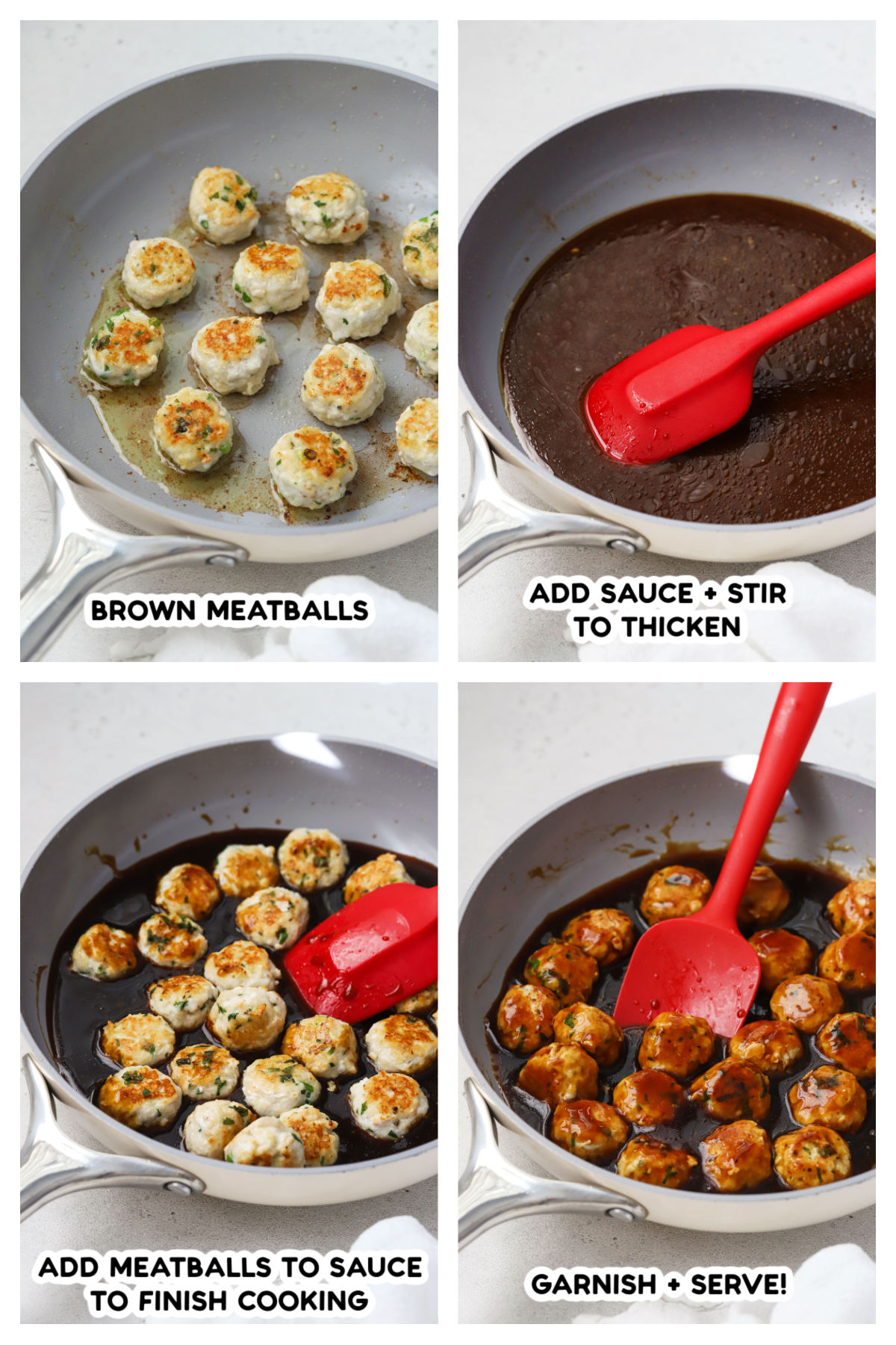 1. Brown Meatballs. Heat 1 Tablespoon oil in a large skillet over medium heat. Working in batches (I cook 1/2 the meatballs at a time!), brown meatballs 2-3 minutes per side, just till golden brown. The meatballs will NOT be fully cooked through at this point. Set aside on a clean plate and repeat until all meatballs are browned, adding more oil, if needed.